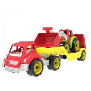 Пластиковый красный автовоз с заездом. В комплекте также идёт трактор.