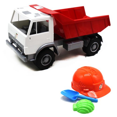 Игровой набор состоит из большого грузовика с подвижным кузовом, каски строителя и лопатки и пасочки (разные цвета и формы попадаются в наборах случайным образом). Размер грузовика: 18х37х16 см. Диаметр каски: 18 см.