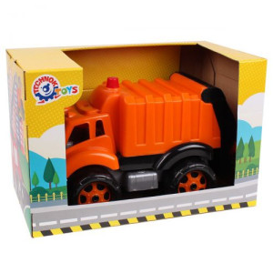 Большой грузовик мусоровоз с огромными колёсами. В наборе есть мусорный контейнер, который можно наклонять и снимать, грузовик также имеет подвижный подъёмник. Изготовлен из крепкого пластика.