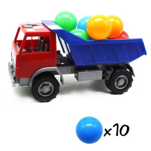 Машинка пластиковая 'Самосвал' с шариками. Можно использовать для увлекательных игр в стройплощадку как дома так и на улице. Подвижный кузов, для удобной загрузки и разгрузки песка, игрушек или других элементов. В наборе мягкие пластиковые шарики d=7 см.