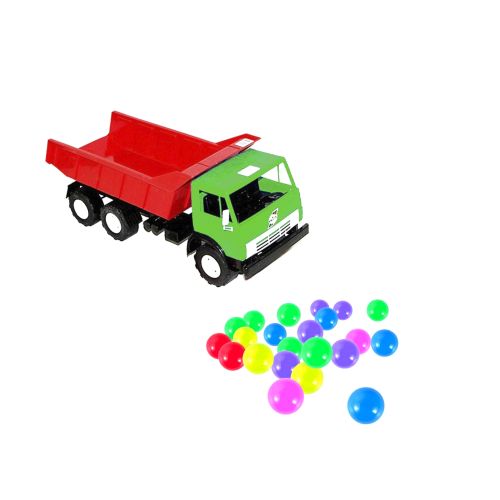 Машинка 'Самосвал' с шариками. Машина с откидным кузовом, для удобной загрузки и разгрузки песка или игрушек. 18 пластиковых шариков в комплекте. Диаметр - 6,5 см.