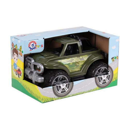 Мощный военный джип с огромными колёсами и бампером. Изготовлен из крепкого пластика, имеет камуфляжный окрас. В машине одно пассажирское место, одно место водителя и открытый багажник.