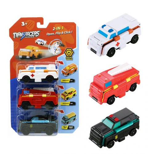 Машинки трансформеры 'TransRacers'. Особенность данного вида машинок заключается в том, что одну машинку можно трансформировать в совершенно другую. 3 машинки в наборе. Длинна 1 машинки 8 см. Выполнены из качественного пластика. Для детей от 3-х лет.