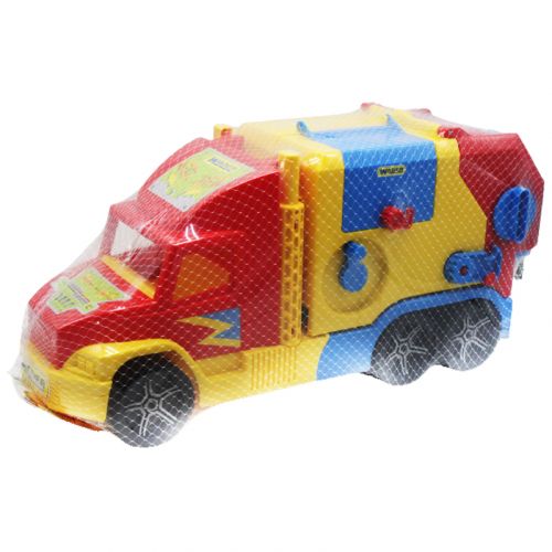 Машинка 'Super Truck'. Автомобиль имеет открывающееся багажное отделение, куда попадают мусорные баки (в комплекте есть два бака). В кузовное отделение мусоровоза установлен механизм выгрузки. Высокая детализация, качественный пластик. Размер: 54х27х18 см.