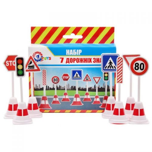 Набор '7 дорожных знаков. Каждый дорожный знак состоит из 3-х частей + наклейка. С их помощью малыш сможет воссоздать реальные дорожные ситуации: переезд перекрестка, железнодорожного переезда, выезд из второстепенной дорогу на главную и другие.
