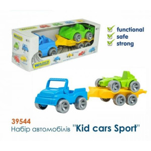 Набор состоит из машинки пикапа, к которому крепится прицеп на колёсах, при помощи которого автобус может перевозить квадроцикл. Размер одной машинки: 9 см. Машинки очень яркие, изготовлены из качественного пластика.