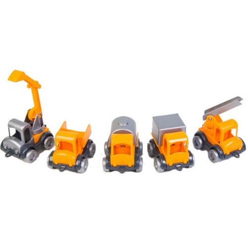 Набор машинок 'Маленький строитель Kid cars'. 5 машинок в наборе: грузовик, грузовик с цистерной, грузовик с открытым кузовом, экскаватор и автокран. С подвижными элементами. Размер одной машинки - 11 х 7 х 7,5 см.