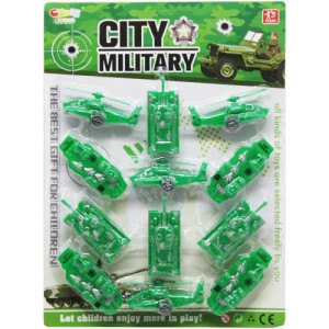 Пластиковый набор военной техники. В наборе 12 игрушек техники, в том числе 4 вертолета. Размер одной игрушки 9х4 см. Выполнены из прочного пластика. Предназначено для детей от 3-х лет.