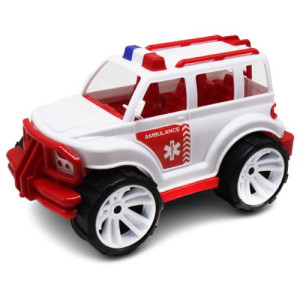 Яркая пластиковая машинка внедорожник с большими колёсами. Размер игрушки 32х20х17 см, диаметр колес 8,5 см. Имеет водительские и пассажирские места в салоне. Изготовлена из качественного и прочного пластика.