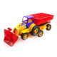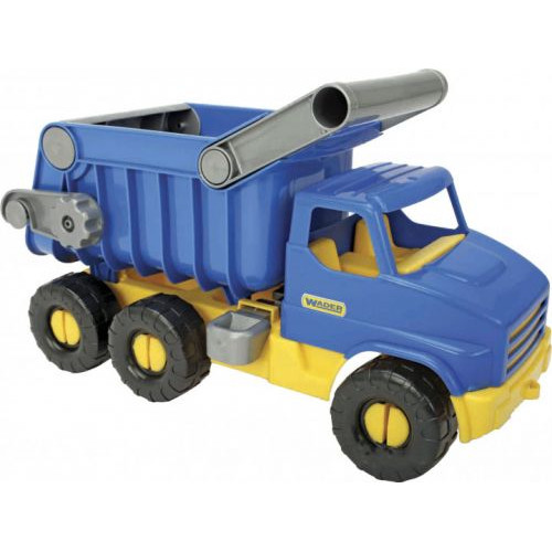 Кузов самосвала может подниматься и опускаться, а также открывается задняя крышка. Игрушечная машинка отличается прочной конструкцией и маленьким весом.