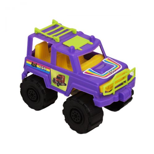 Яркая пластиковая машинка внедорожник с большими колёсами. Имеет водительское место и 3 пассажирских. Изготовлена из качественного пластика.
