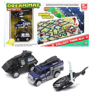 Игровой набор включает в себя полицейский транспорт: 2 машинки и вертолет, а также игровой коврик. Коврик размером 80х70 см, на котором нанесено изображение города - с дорогами и домами. Игрушки выполнены из металлопластика, хорошо детализированы. Размер одной машинки 7,5 см, сделаны в масштабе 1:64 с настоящей техникой. Набор выполнен из качественных и безопасных материалов. Для детей от 3-х лет.