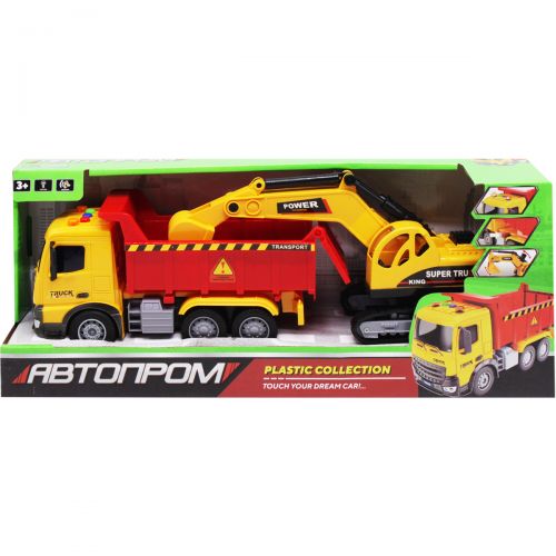 Оригинальный пластиковый набор 'Спецтехника' будет отличным подарком любому малышу. В комплект входит самосвал и экскаватор. Самосвал, размером 23х10х8,5 см, оснащен звуковыми и световыми эффектами, имеет подвижный ковш. Экскаватор размером 11х8х9 см, имеет подвижный ковш. Для детей от 3-х лет.