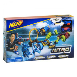 В набор входит запуск в форме пистолета, 3 вида трамплинов (с аркой, с воротами, и с баками,которые нужно сбивать) и 2 машинки(красного и синего цвета). Выполнен набор из качественного пластика.Для детей от 5 лет.