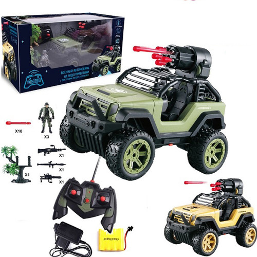 Военный автомобиль на радиоуправлении с фигурками солдат и оружием.