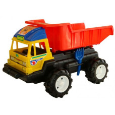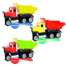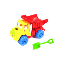 Яркий пластиковый грузовик с откидным кузовом. В комплекте с ним также идёт набор с лопаткой и форма..