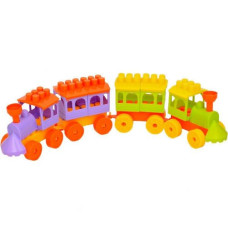 Яркий пластиковый конструктор поезд. Состоит из локомотива, прицепа (которые можно соединять), фигур..