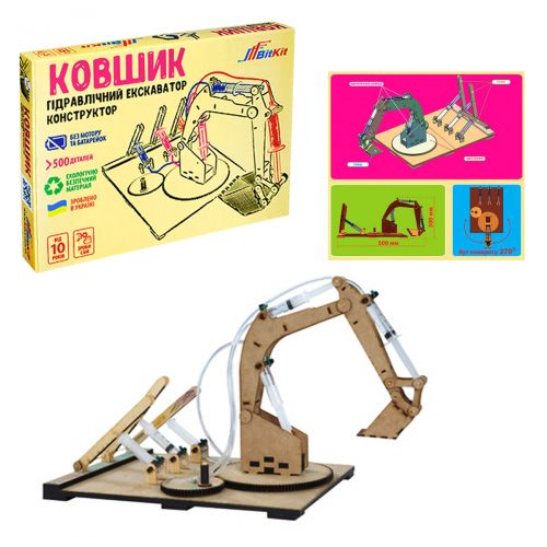 Конструктор гидравлический 'Ковшик'. Особенности данного конструктора: без мотора и не требуетаккумуляторов; гидравлический и зубчатый механизм; возможность управления ковшом (наклон, поворот, оборот); собирается быстро и не требует дополнительных инструментов. Подымает вес до 200 г. Для детей от 10 лет.