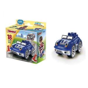 Игрушка-конструктор 'Автоклуб', 18 деталей. Представляет собой сборную машинку (блочная основа, каркас машинки, 4 колесных диска, 4 шины) и 4 дорожных конуса (каждый состоит из 2-х элементов) + наклейки. Все элементы игрушки изготовлены из качественного пластика — легкого и прочного материала, предназначенного для многократной сборки.