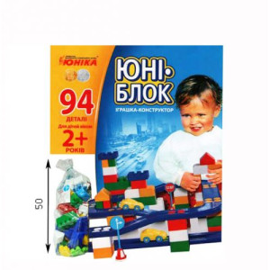 Конструктор 'Юни-блок' (94 детали). Набор состоит из 94 деталей, используя которые, ребенок сможет создать круговую дорогу. 2 машинки и дорожные знаки в комплекте. Размер квадратного блока - 5 х 5,5 х 5,5 см.
