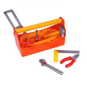 Набор инструментов в коробке. Состоит из органайзера, плоскогубцев, кутника, молотка, пилки по дереву, пилки по металлу, разводного ключа, 2 насадки для отвертки, ручка отвертки, пояса, коробки. Все сделано из высококачественного пластика. С набором можно весело играть в инженеров-электриков. Выглядит очень ярко и цветасто.