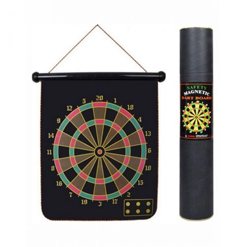 Двухсторонняя магнитная мишень (на тканевой поверхности в виде свитка). Диаметр мишени - 30 см. В комплекте идут 6 магнитных дротиков (2 цвета).