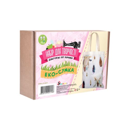 | Комплектация | Сумка из двунитки, салфетка для декупажа "Ловец снов", салфетка для декупажа "Перо", клей для декупаа по ткани 20 мл, кисть |