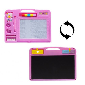 Двухсторонняя пластиковая доска для рисования магнитной основой с одной стороны и мелками с другой. В наборе: магнитная ручка, печати, мелки и губка. На доске предусмотрены счеты и колесико с цифрами для изучения математики. Готовый рисунок можно стереть, потянув за бегунок внизу доски. Размер поля для рисования - 13 х 18 см.