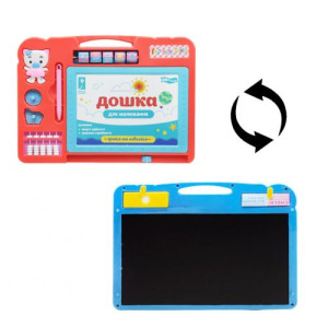 Двухсторонняя пластиковая доска для рисования магнитной основой с одной стороны и мелками с другой. В наборе: магнитная ручка, печати, мелки и губка. На доске предусмотрены счеты и колесико с цифрами для изучения математики. Готовый рисунок можно стереть, потянув за бегунок внизу доски. Размер поля для рисования - 13 х 18 см.