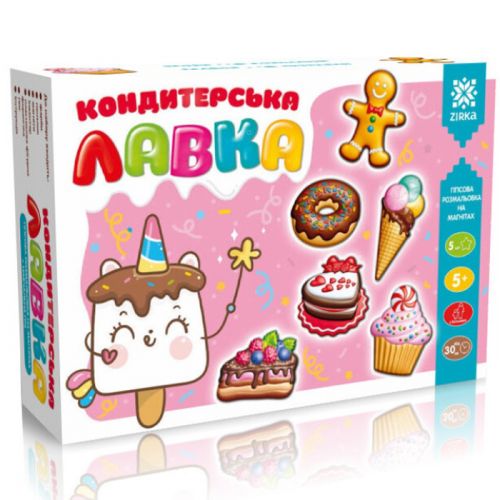 Гипсовая раскраска на магнитах 'Кондитерская лавка'. Создай магнитик, раскрась его и повесь его на холодильник. В наборе: гипс, магнитики (5 шт.), формочка (5 ), краски, кисточка, инструкция.