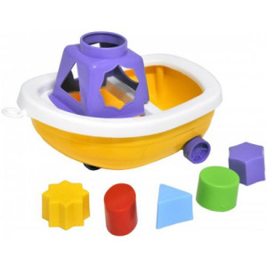 Яркая пластиковая игрушка соединила в себе два элемента - красивую игрушку и сортер. Кораблик на колесиках, к нему можно привязать веревочку и возить за собой. На каюте расположены отверстия в виде разных геометрических фигур. В комплекте есть 5 элементов сортера разных цветов и форм. Размер корабля 11х20х13 см.