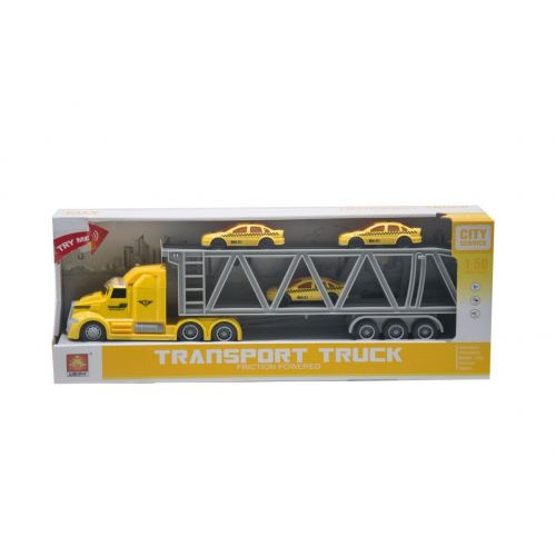 Инерционная машинка 'Автовоз'. Задний борт откидывается, в результате чего на него можно погрузить 3 машинки, которые также входят в набор. Трейлер оснащен световыми и звуковыми эффектами. Масштаб - 1:50.