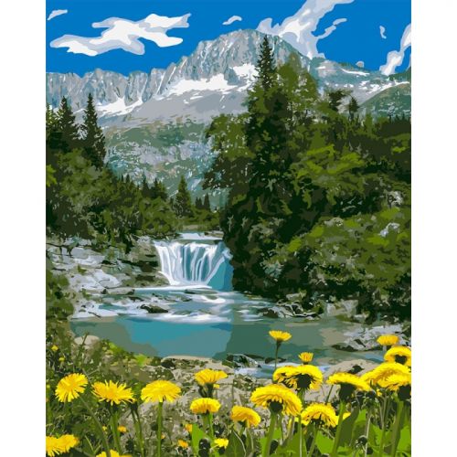 Картина по номерам 'Горный водопад'. Для того, чтобы нарисовать картину, необходимо рисовать по пронумерованным контурам, которые соответствуют цвету краски. В наборе: натуральный холст на подрамнике с галерейной натяжкой, бумажная копия с контурным рисунком картины (на картине нанесена схема контуров изображения с нумерацией), 3 нейлоновые художественные кисти, палитра акриловых красок в контейнерах, крепление. Все необходимые краски уже в комплекте и не требуют смешивания. Размер: 40 х 50 см. Количество цветов: 27. Сложность - ★★★★★.