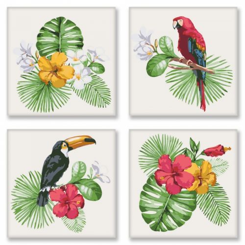 | Комплектация | 4 полотна на деревянных подрамниках, 3 кисточки (широкий, средний и маленький), набор акриловых пронумерованных красок, контрольный лист (изображения, дублирует рисунок на холсте), инструкция |