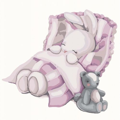 Картина по номерам 'Спокойной ночи, зайка'. Для того, чтобы нарисовать картину, необходимо рисовать по пронумерованным контурам, которые соответствуют цвету краски. В наборе: натуральный холст на подрамнике с галерейной натяжкой, бумажная копия с контурным рисунком картины (на картине нанесена схема контуров изображения с нумерацией), 2 нейлоновые художественные кисти, палитра акриловых красок в контейнерах, крепление. Все необходимые краски уже в комплекте и не требуют смешивания. Размер: 30 х 30 см. Количество цветов: 20. Сложность - ★★★.
