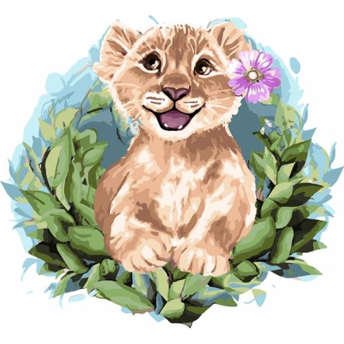 Картина по номерам 'Волшебный львёнок'. Для того, чтобы нарисовать картину, необходимо рисовать по пронумерованным контурам, которые соответствуют цвету краски. В наборе: натуральный холст на подрамнике с галерейной натяжкой, бумажная копия с контурным рисунком картины (на картине нанесена схема контуров изображения с нумерацией), 2 нейлоновые художественные кисти, палитра акриловых красок в контейнерах, крепление. Все необходимые краски уже в комплекте и не требуют смешивания. Размер: 30 х 30 см. Количество цветов: 29. Сложность - ★★★★.