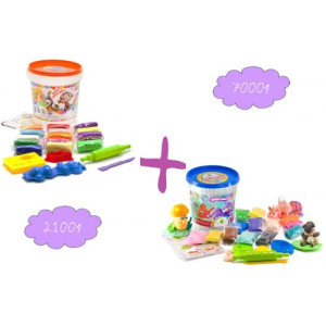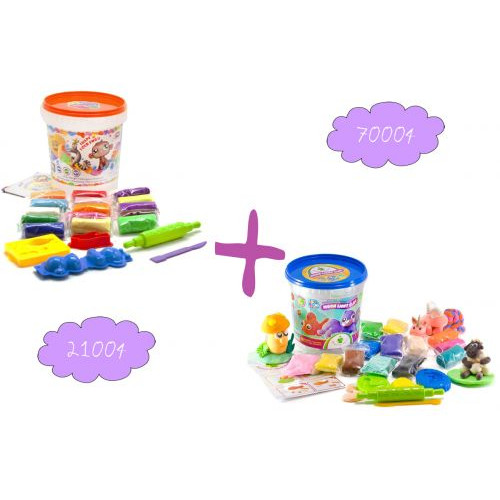 Набор содержит две позиции: 1) Легкий прыгающий пластилин 'Moon Light Clay 1'. Предназначено для развития детских творческих способностей к лепке и моделирования. Эта масса обладает удивительными качествами, мягкая, приятная и шелковистая на ощупь и не липнет к рукам. В комплекте: легкий магический пластилин (10 шт.), тесто для лепки (3 шт.), формочки (3 шт.), скалка, стек, инструкция. 2) Набор для лепки 'Ассорти 3' (1 л). В наборе: 15 пакетиков с тестом по 20 г, 4 цветные 3D формочки животных, нож стек. Развивает мелкую моторику рук.