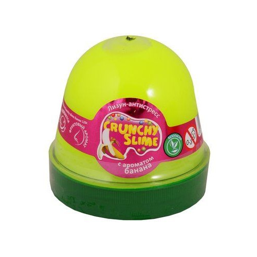 Лизун-антистресс 'Crunchy Slime'. Состоит из вязкого материала, который можно растягивать, сжимать. Может прыгать как настоящий попрыгунчик. Приятный на ощупь. С ароматом банана.