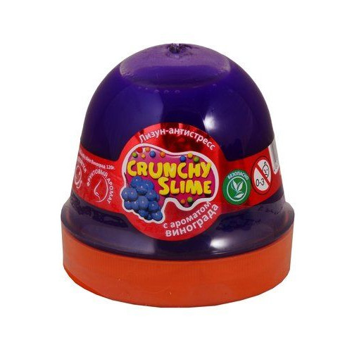 Лизун-антистресс 'Crunchy Slime'. Состоит из вязкого материала, который можно растягивать, сжимать. Может прыгать как настоящий попрыгунчик. Приятный на ощупь. С ароматом винограда.