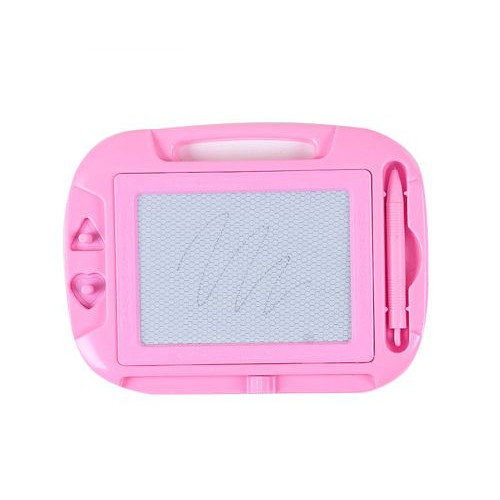 Яркая пластиковая доска для рисования. Имеет магнитную основу. В наборе: магнитная ручка и 2 печати (в форме треугольника и сердечка). Готовый рисунок можно стереть, потянув за бегунок внизу доски.