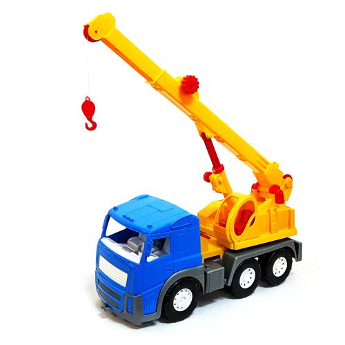 Машина строительная 'Автокран Акрос'. Имеет подвижные элементы: башня крана, стрела (поднимается, опускается, выдвигается), барабан. 3 механизма управления: подъем стрелы, выдвижение стрелы, регулировка 'тросов'. Высокая детализация, качественный пластик.