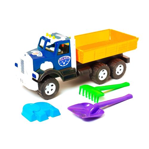 Машинка 'Фарго Самосвал' с песочным набором. С откидным кузовом для удобно выгрузки. Лопатка, грабли и пасочка в комплекте.