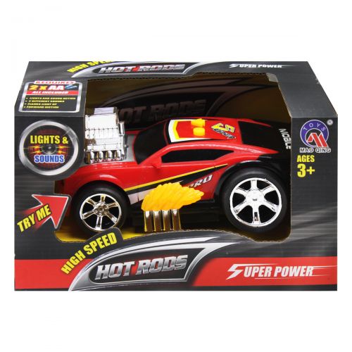 Пластиковая гоночная машинка. Есть световые и звуковые эффекты (светятся фары, звук мотора), которые активируются нажатием кнопок на крыше. Так же, одна из кнопок активирует движение машины (вращаются задние колеса). Размер машинки - 15х7х7 см., диаметр колес - 3 см. (передние) и 4 см. (задние). Выполнено из качественных, безопасных материалов.