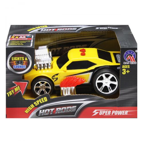 Пластиковая гоночная машинка. Есть световые и звуковые эффекты (светятся фары, звук мотора), которые активируются нажатием кнопок на крыше. Так же, одна из кнопок активирует движение машины (вращаются задние колеса). Размер машинки - 15х7х7 см., диаметр колес - 3 см. (передние) и 4 см. (задние). Выполнено из качественных, безопасных материалов.