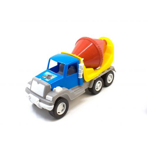 Яркая пластиковая машинка бетономешалка. Барабан можно крутить, а ещё он открывается, позволяя помещать что-то во внутрь.
