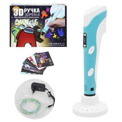 3D-ручка позволяет рисовать объекты в 3D пространстве; создавать фигуры на бумаге (2D), затем, отделяя бумагу от пластика, получать готовуб фигуру, либо одну из деталей фигуры; соединять изделия из пластика между собой. 3D ручка имеет удобный и стильный корпус, который отлично помещается даже в руке у ребенка. Керамический носик делает 3D ручку еще более безопасной и практичной. Рисует пластиком АВS и PLA. Есть регулировка температурі и скорости. В наборе есть карточки с изображениями героев игры 'Among us', которые можно использовать как трафареты.