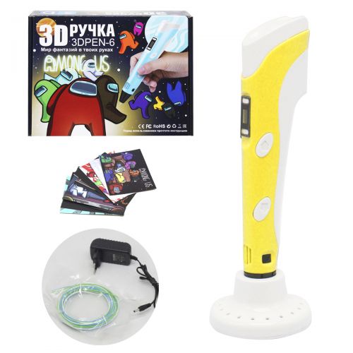 3D-ручка позволяет рисовать объекты в 3D пространстве; создавать фигуры на бумаге (2D), затем, отделяя бумагу от пластика, получать готовуб фигуру, либо одну из деталей фигуры; соединять изделия из пластика между собой. 3D ручка имеет удобный и стильный корпус, который отлично помещается даже в руке у ребенка. Керамический носик делает 3D ручку еще более безопасной и практичной. Рисует пластиком АВS и PLA. Есть регулировка температурі и скорости. В наборе есть карточки с изображениями героев игры 'Among us', которые можно использовать как трафареты.