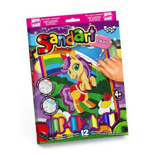 Набор для творчества 'Sandart' фреска из цветного песка. Развивает креативное мышление, творческие способности, художественный вкус. Без ножниц и клея. Инструкция: 1) Отделите с участков, обозначенных одним определенным номером, высеченную защитную пленку; 2) Засыпьте на открытую липкую поверхность песок выбранного цвета. Вы можете украсить картину глиттерными блестками, заменив любой цвет песка на глиттер, на свое усмотрение.