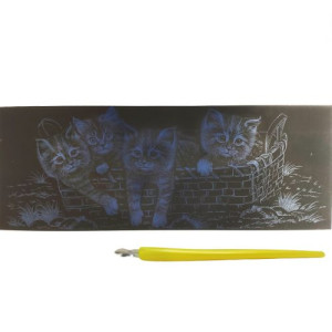С помощью штихеля необходимо провести по контуру рисунка линии, постепенно создавая изображение. В набор входит: основа с нанесённым контуром, специальный штихель (пластиковая ручка-гравер с металлическим наконечником), инструкция. Размер готовой работы: 410 x 150 мм.