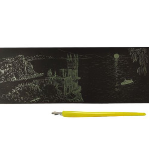 С помощью штихеля необходимо провести по контуру рисунка линии, постепенно создавая изображение. В набор входит: основа с нанесённым контуром, специальный штихель (пластиковая ручка-гравер с металлическим наконечником), инструкция. Размер готовой работы: 410 x 150 мм.